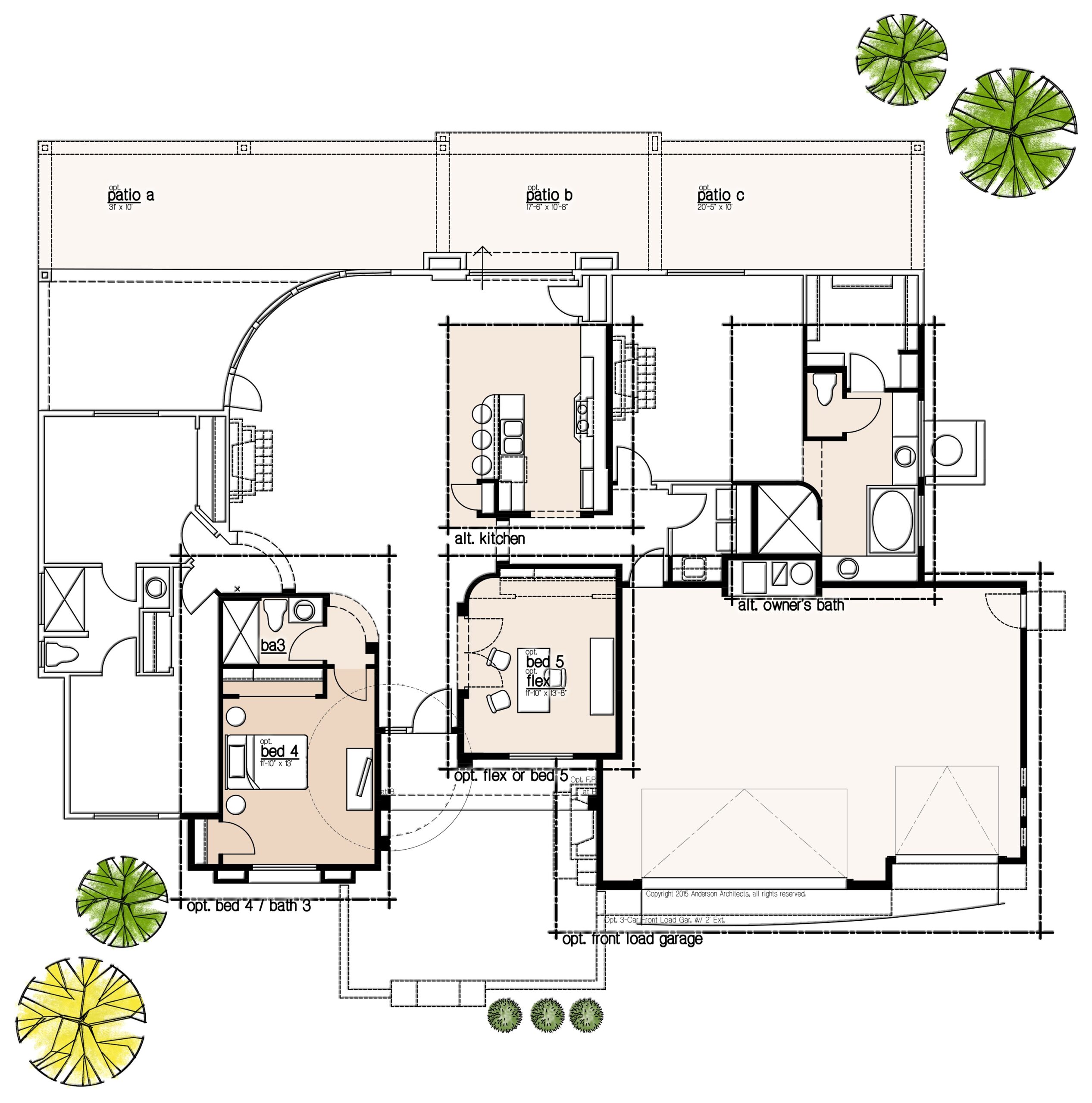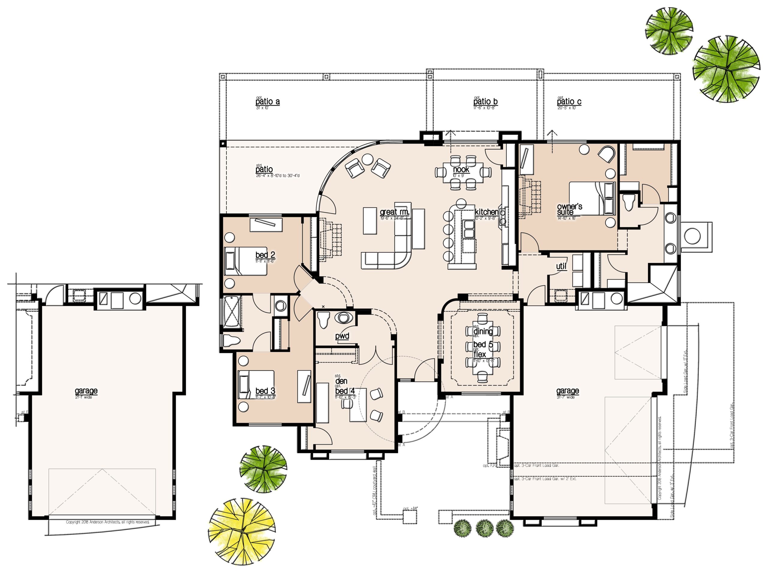 Single Family Home, Single Story, 3 Bedroom, Dining Room, Kitchen, Great Room, Den, Nook, 2 ½ Bath, 3 Car Side-Load Garage, Optional 4th Bedroom w/Full Bath, Optional 5th Bedroom, Optional 3 Car Front-Load Garage Layout